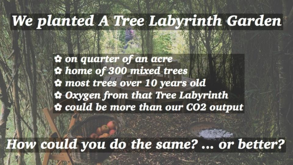 Those Tree Labyrinth trees are well over 10 years old, 15 years old now, and 12 years old in the photograph here. Through using the online calculation tools at TreeChange.ie, I remarkably discovered that Tree Labyrinth was more than offsetting the CO2 I caused through my quite minimal car driving combined with my home energy use.