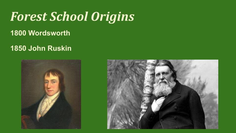 The earliest known semi organised version of ‘forest schooling’ I know of, is that 19th century poets, Wordsworth and John Ruskin, took people to the woods, during the 19th century.