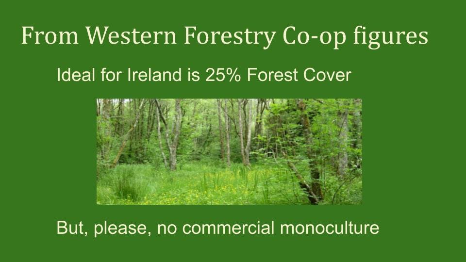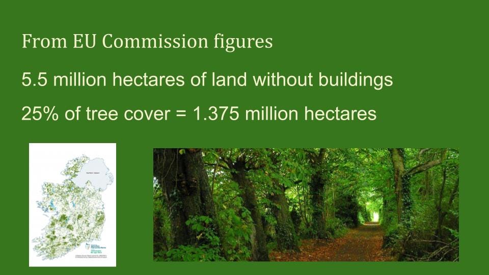 Considering the number of homes in Ireland, this breaks down to about a quarter of an acre of woodland per home.